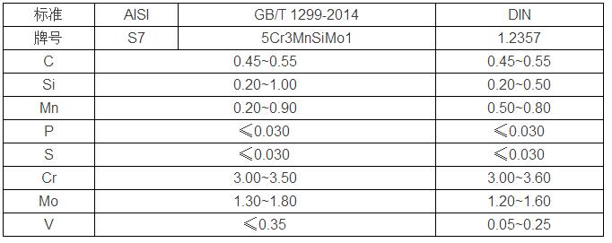 成分規(guī)范:S7對應(yīng)國標牌號為5Cr3MnSiMo1,成分一致。